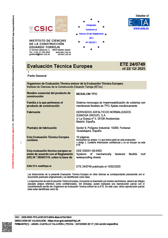Evaluación Técnica Europea láminas NEXALON TPO para sistemas fijados mecánicamente