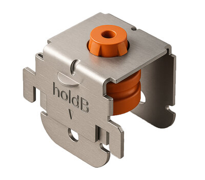 holdB es un amortiguador de elastómero más acero que incorpora dispositivo de bloqueo. Su fijación directa a los perfiles de techo de 47 mm y su diseño compacto permiten una instalación rápida y segura, optimizando el aislamiento acústico y la durabilidad del conjunto.
